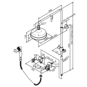 Nostalgisk takdusj med 200mm dusjhode. Messing overflate. Hånddusj med porselensdetaljer. Messing overflate. Justerbar høyde på stang 1020-1250mm. Eco-save og skoldesperre på termostatkran. Metallslange med anti-twist.