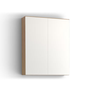 Ramme i hvitpigmentert eik. Underlys LED 7,5W. To dobbeltsidige dempede speildører. Magnet og løst forstørrelsesspeil er festet for valgfri plassering. To glasshyller medfølger. Leveres montert. Stikkontakt 230V inkludert. Beskyttelsesklasse IP44. Fargetemperatur 3000K. Energiklasse A ++. Dimbar. Belysning går på 230V direkte og krever ingen driver.