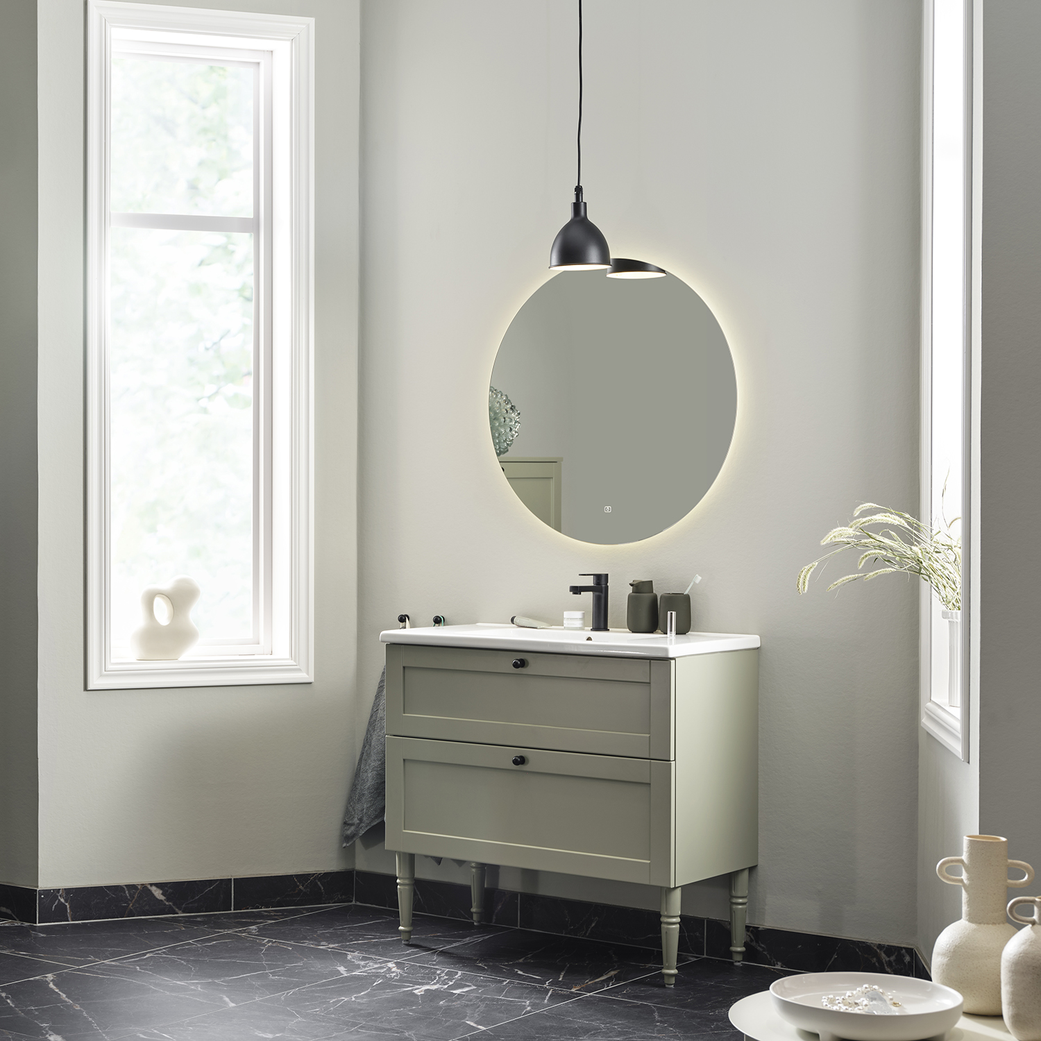 Rundt speil med dekorlys LED, av/på-knapp på speilet, dimmer og justering av fargetemperatur 3000–6000K. Kapslingsgrad IP44. Energiklasse F. Kan kombineres med belysning Broby og Dala.