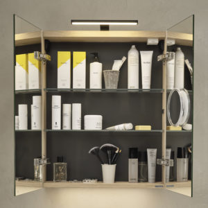 Dobbeltsidig speildør(er) med demping. Speilskapet er forberedt for elektrisk installasjon på oversiden mot taket. Flyttbare glasshyller er inkludert. Underbelysning LED 7,5W. Integrert 230V stikkontakt, magnetlist er inkludert, og det følger med et flyttbart forstørrelsesspeil for valgfri plassering. Energiklasse F. Kapslingsgrad IP44. Fargetemperatur 3000K. Dimbar.