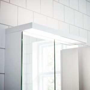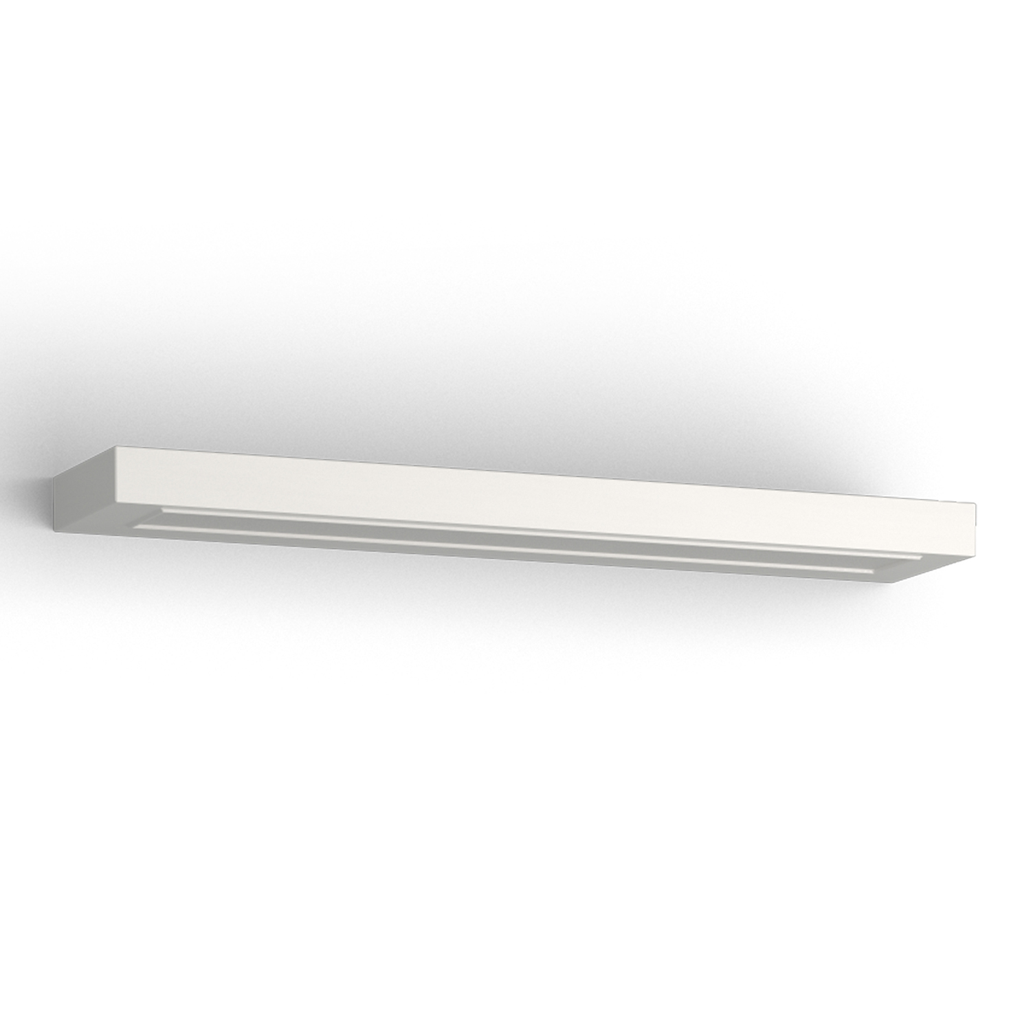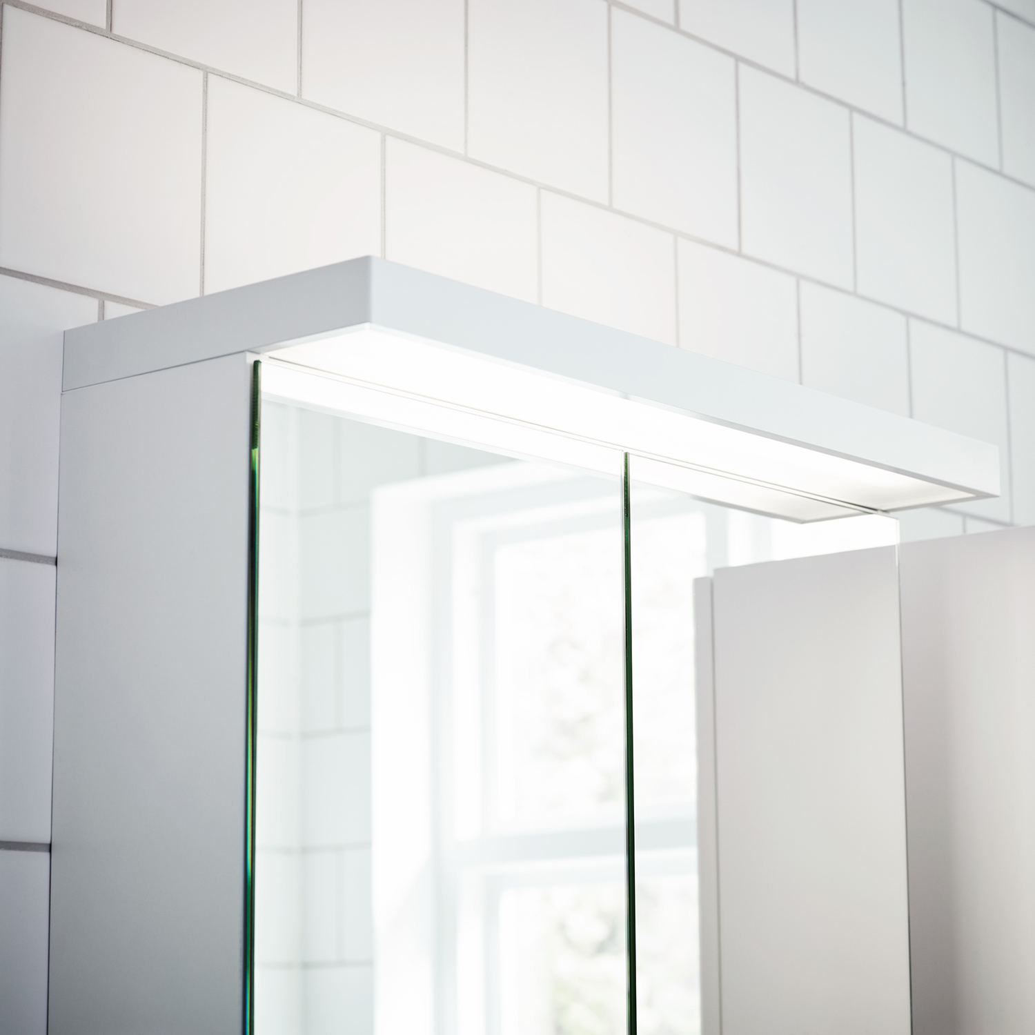 Skapbelysning LED. Hvitmalt metallplate. Lyser oppover og nedover. Kapslingsgrad IP44. Energiklasse D. Fargetemperatur 3000K. Dimbar. Kan kombineres med speilskap Basic og Viken 500.
