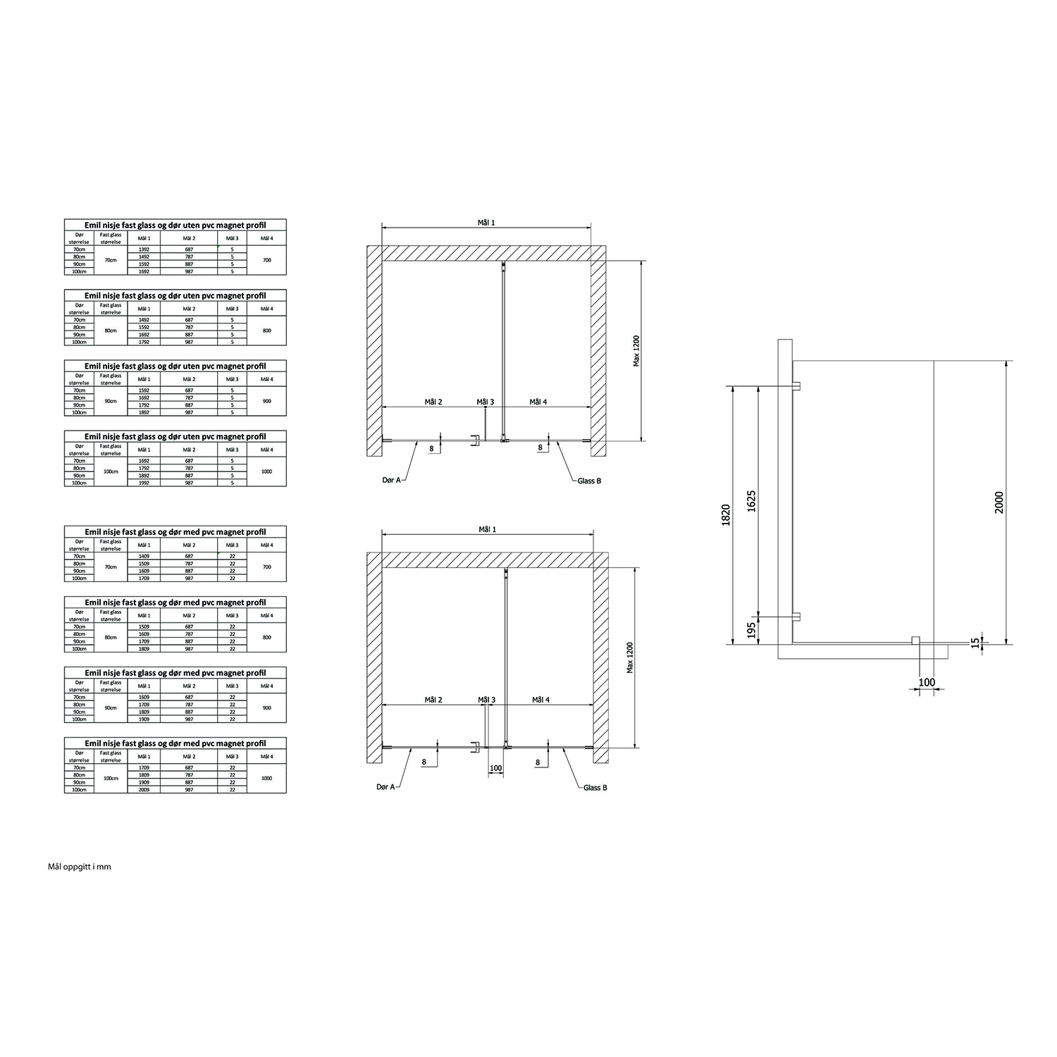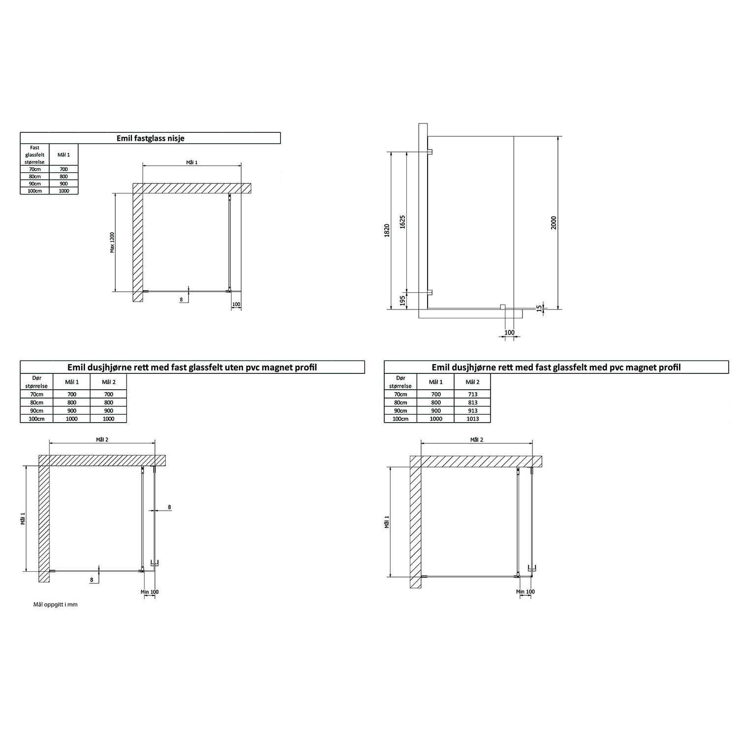 Emil dusj har begrenset justeringsmuligheter mot vegg, men vil alltid kunne monteres så sant veggens toleranseklasse er i henhold til normalkrav for innervegger angitt i NS3420-1 (3mm helling pr høydemeter). Målene er oppgitt i ytterkant glass, husk å sjekk installasjonsveilederen eller dusjkalkulatoren for finne den dusjløsning som passer ditt bad.