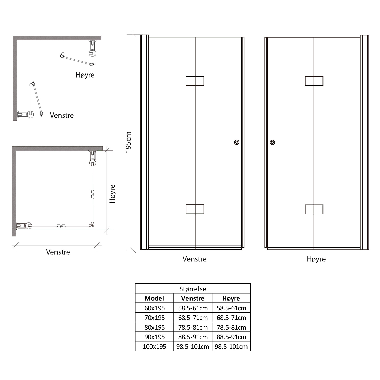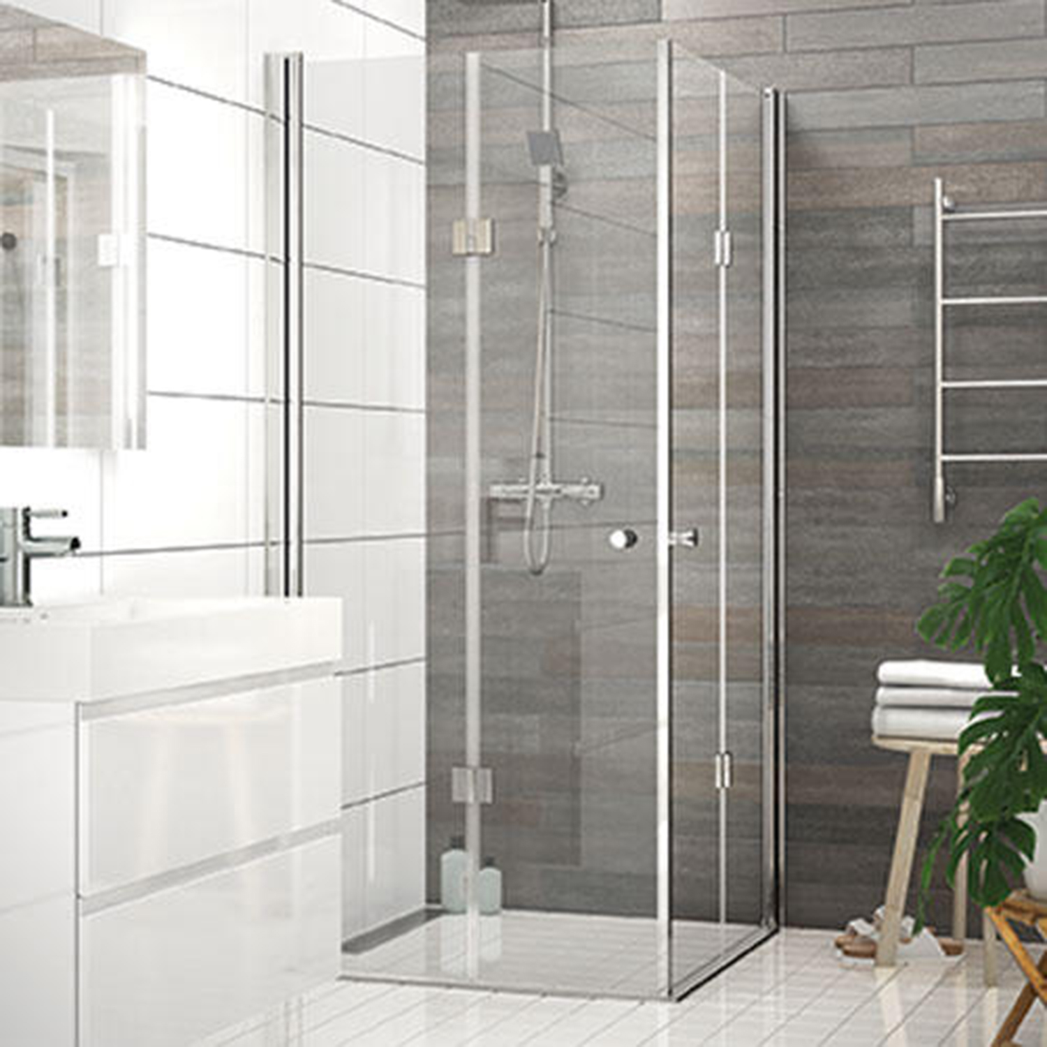 Leddet dusjdører er en stadig mer populær løsning, særlig på små baderom. Døren kan foldes helt inntil vegg og frigjør dermed gulvplassen når dusjen ikke er i bruk. Dusjhjørne i glass som består av doble leddete svingdører. Leveres med veggfester og dørhåndtak.
