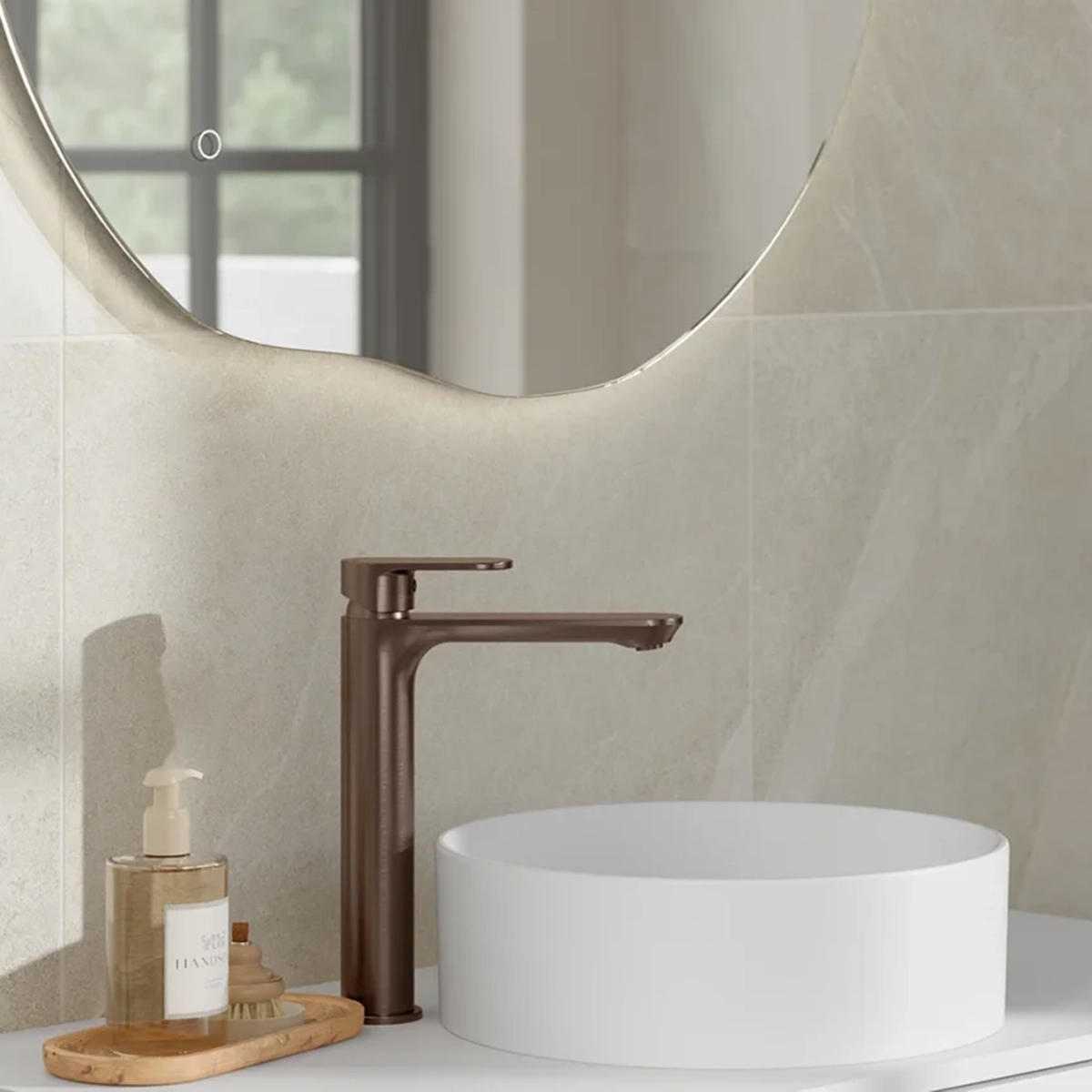 - Organisk design som gir badet et moderne og levende uttrykk