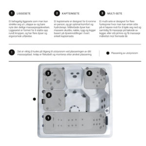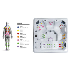 MORILD gir deg full massasje av rygg, legger, lår og føtter i et moderne designet spa. Morild er utstyrt med 2 kapteinseter samt et stort liggesete. Alle sittesetene har forskjellig dybde slik at massasjebadet passer for personer i de fleste høyder. Med et utgangspunkt i kroppens anatomi og vanlige utfordringer i norsk fysioterapi har vi håndplukket de beste komponentene og satt sammen til det vi mener er blant de beste og mest moderne massasjebadene på markedet. Massasjebadene er skreddersydd for optimal massasje i hvert sete og kombinasjonen av antall dyser sammen med ergonomi og plassering er nøye gjennomført og testet for å gi deg best mulig massasje og fysisk opplevelse. Bruk av våre massasjebad kan derfor være et godt supplement til annen behandling for ergonomiske plager. VikingBad Morild krever fast strømtilkobling, minimum 1-fas 230V/20A. Høyere kurs anbefales.