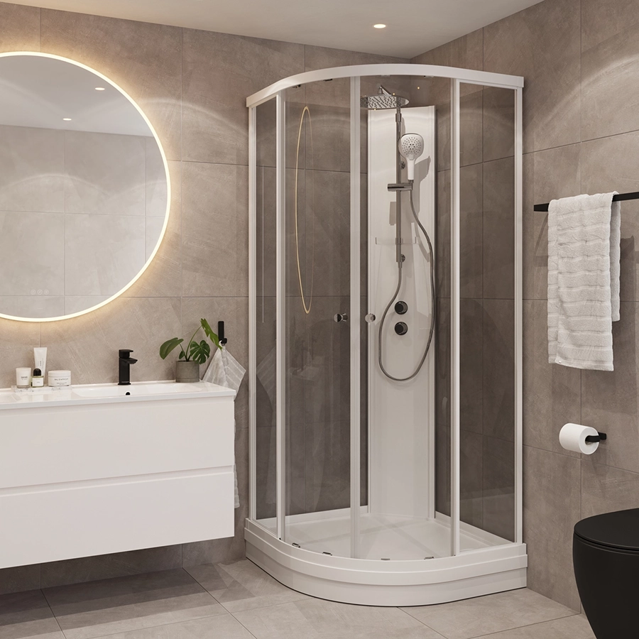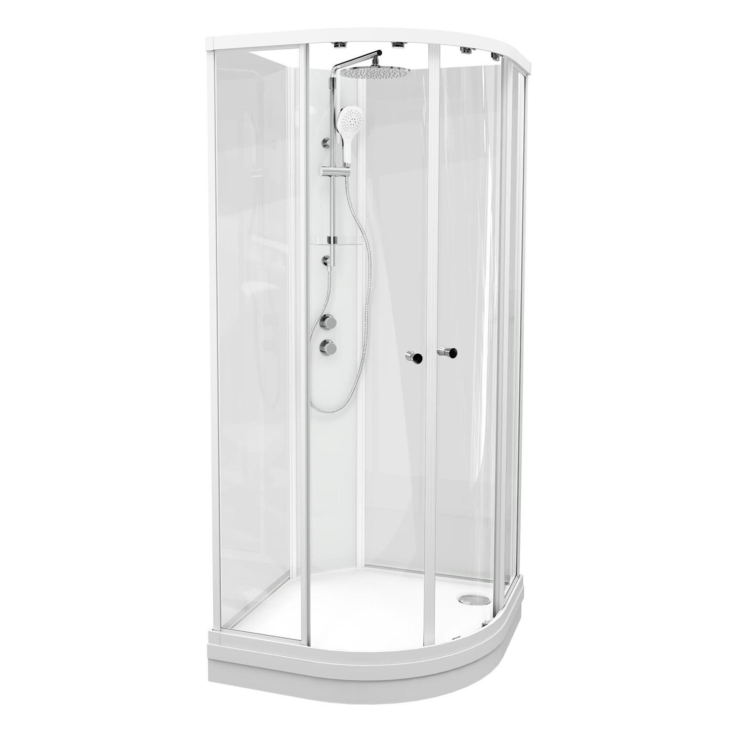 Sofia dusjkabinett med rette, enkle linjer og vippbare dører som gjør det svært enkelt å rengjøre. Dører med doble trinser oppe og nede for jevn og stabil gange ved åpning og lukking. Stabilt dusjkar i glassfiberforsterket akryl med justerbare støttebein. Frontpanel med magnetfeste (som kan demonteres uten verktøy) for enklere installasjon/rengjøring. Leveres med integrert termostatbatteri, dusjsett med praktisk hylle og takdusj.