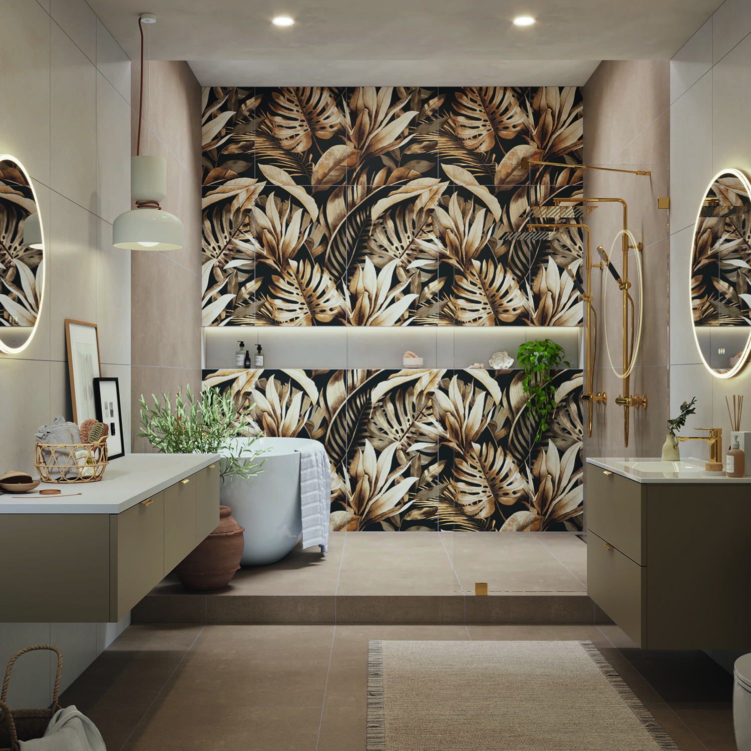 Velg Golden Jungle dekorflis for et moderne og naturlig uttrykk på badet ditt.